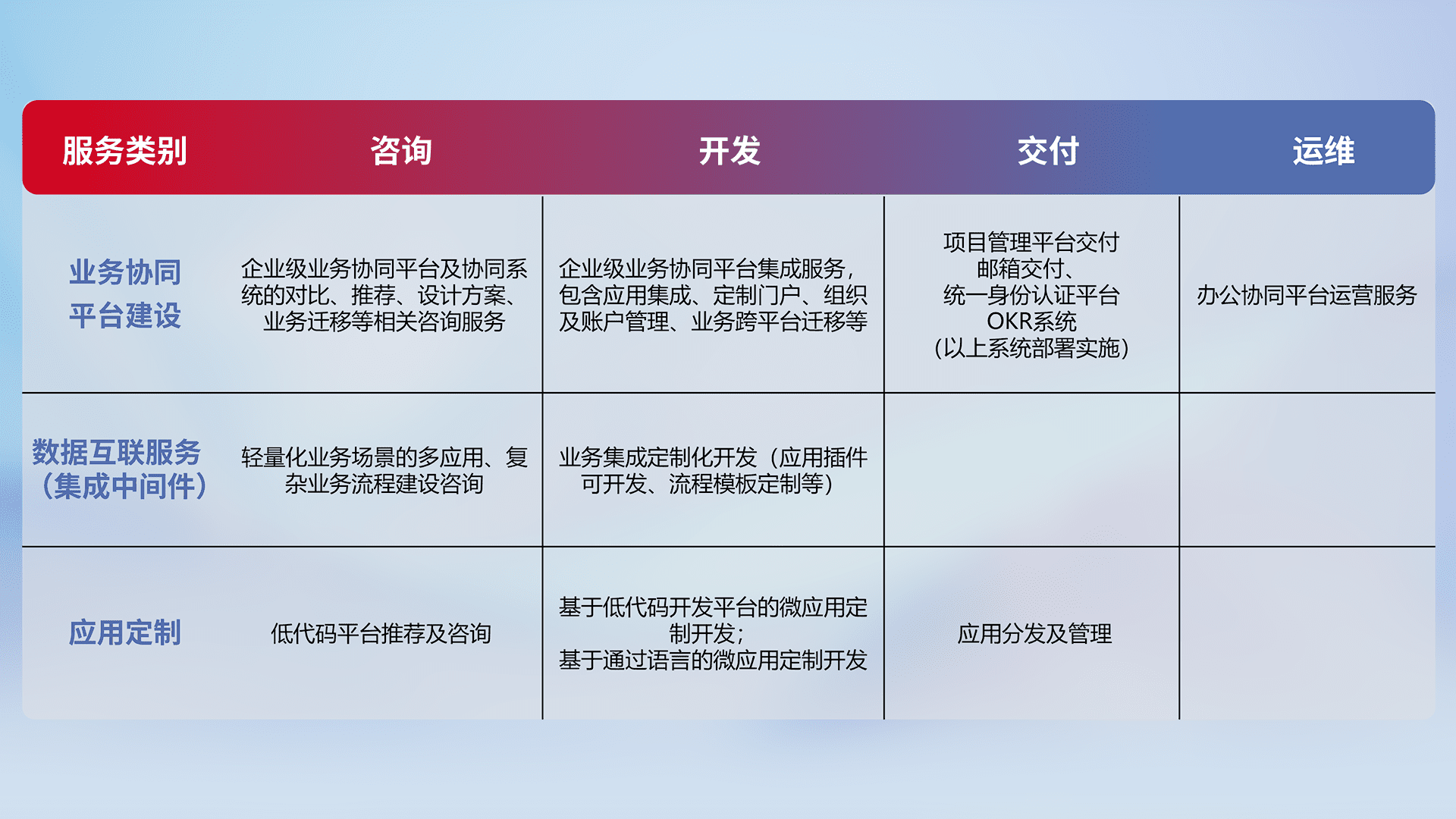 针对钉钉、、、、企微、、、、IDaas等平台级产品提供产品的规划、、、、方案、、交付、、定制化开发等服务,,实现如统一协同办公、、、智能客户服务、、、混合会议管理、、、智能数据查询、、、等业务场景,,,实现数字化转型。。。。